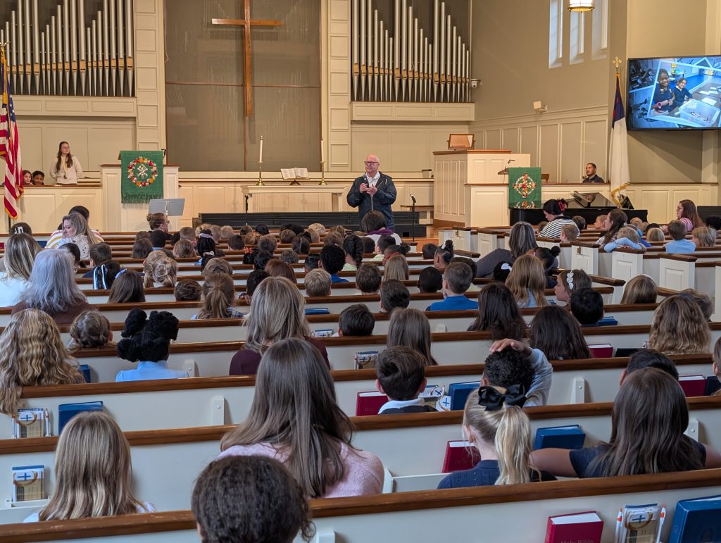 During the chapel service, students sang songs and prayed in English and Spanish.